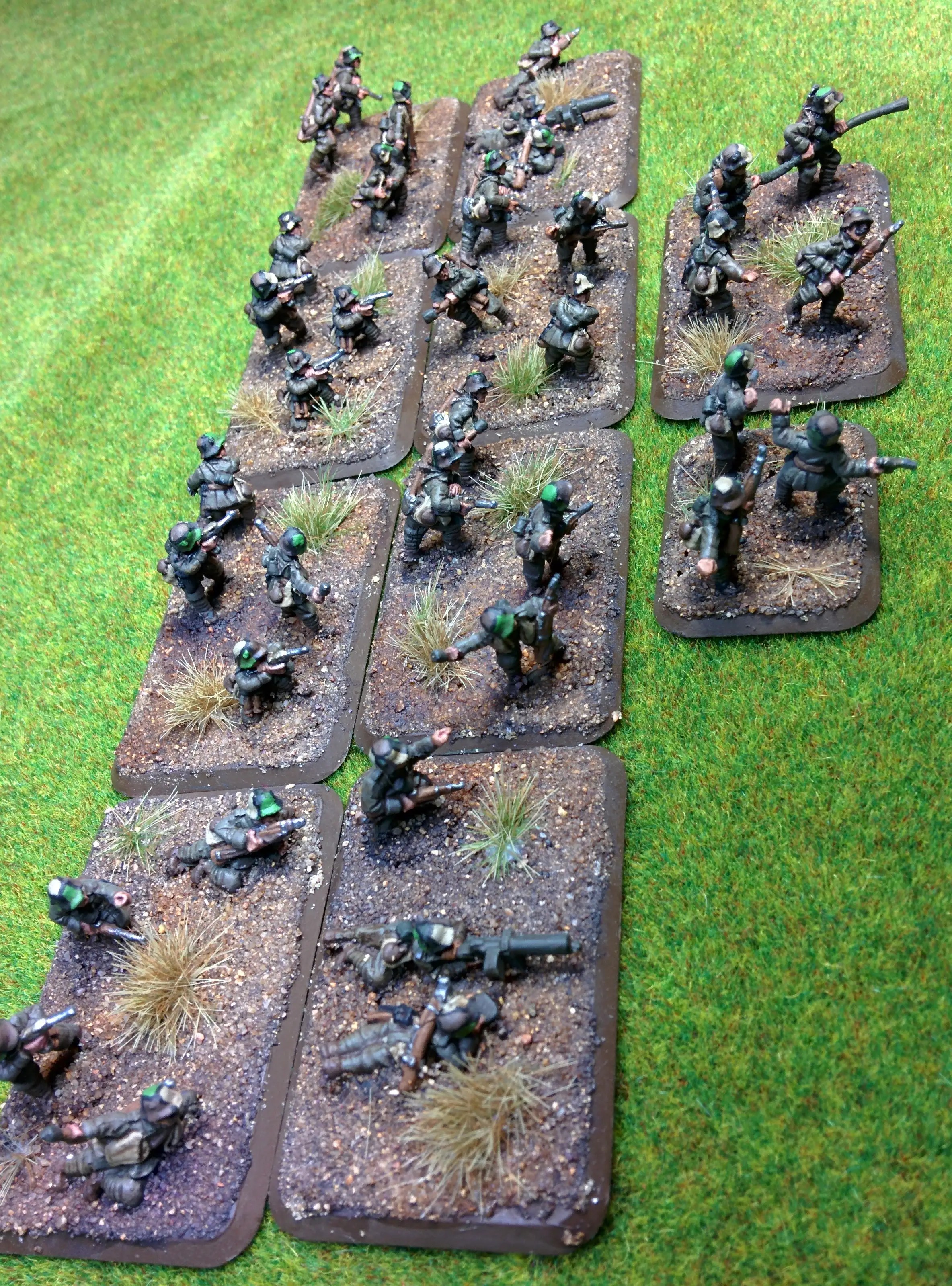 Esto se acaba!! Acabo de terminar el último pelotón para los alemanes de la Gran Guerra, un pelotón de Stoss, las fuerzas de choque del ejercito alemán, donde se empiezan a utilizar las técnicas que harían famosa a la infantería alemana durante la Segunda Guerra Mundial. A nivel de juego estas unidades se diferencia principalmente por llevar armas cortas y de cuerpo a cuerpo para asaltar las trincheras, junto a llevar en el propio pelotón un equipo lanzallamas. A toda la unidad le he pintado el casco con el camuflaje Buntfarbenanstrich.